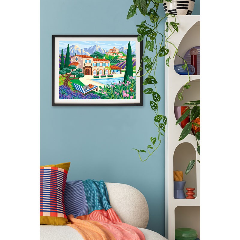 Let yourself be carried away by the brilliance of colour with Palette d'Artiste - Provence paint by numbers. Bring to life, colour by colour, a beautiful house surrounded by greenery and mountains, a sparkling swimming pool and deckchairs perfect for relaxing in the sun.